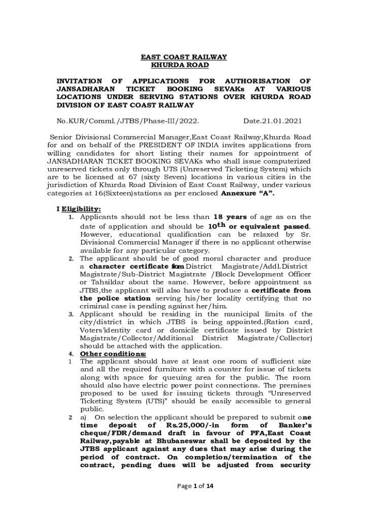 EAST COAST RAILWAY HURD ROAD INVITATION OF APPLICATIONS FOR Authorization OF JANSADHARAN TICKET BOOKING Seats AT VARIOUS LOCATIONS UNDER SERVING STATIONS OVER HURD ROAD DIVISION OF EAST COAST RAILWAY