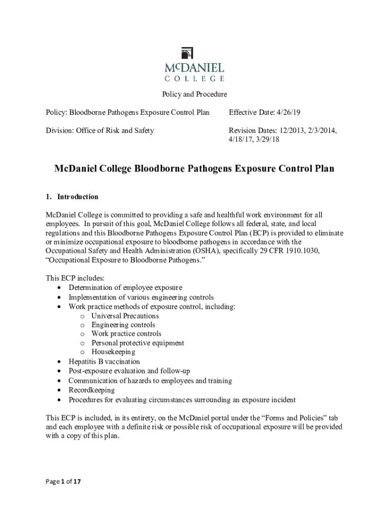 Policy and Procedure Policy: Blood-borne Pathogens Exposure Control Ineffective Date: 4/26/19Division: Office of Risk and SafetyRevision Dates: 12/2013, 2/3/2014, 4/18/17, 3/29/18McDaniel College