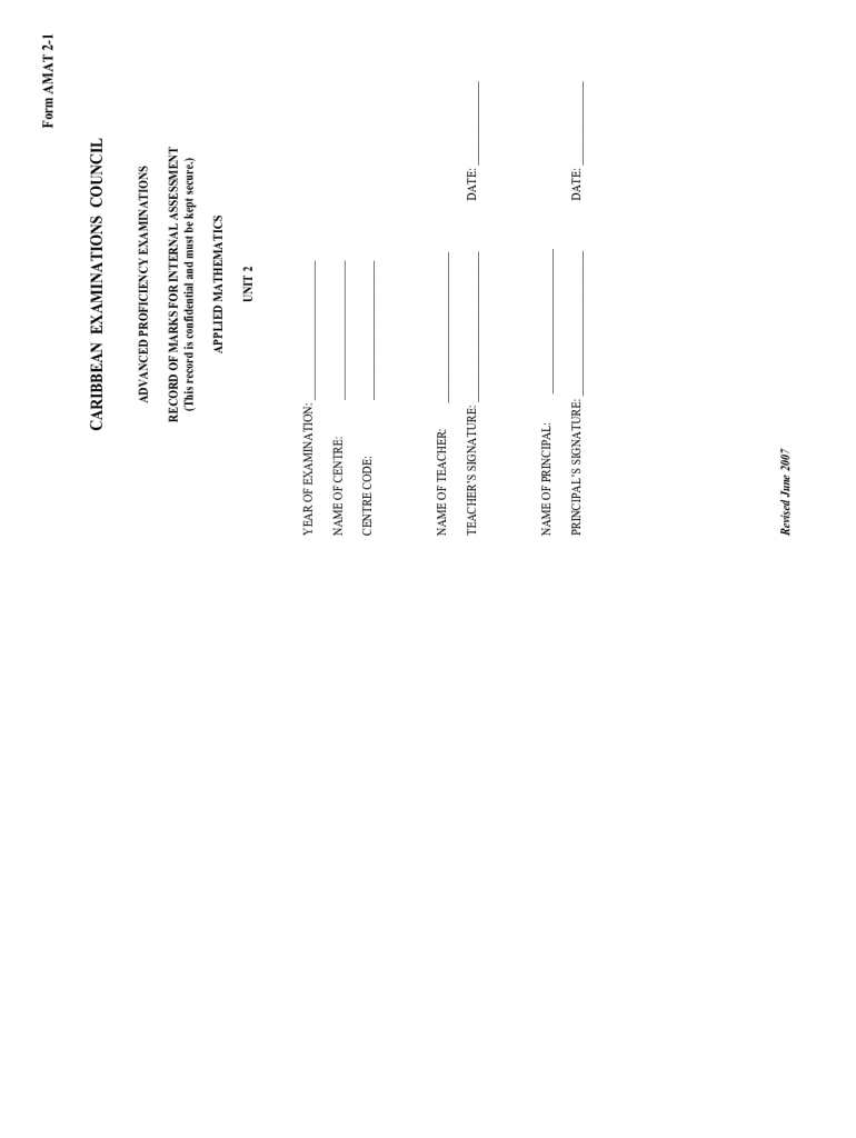 ______Center CODE:NAME OF TEACHER:___Revised June 2007PRINCIPALS SIGNATURE: ___NAME OF PRINCIPAL:TEACHERS SIGNATURE: ______NAME OF Center:YEAR OF EXAMINATION: ___UNIT 2APPLIED MATHEMATICSDATE: ___DATE: