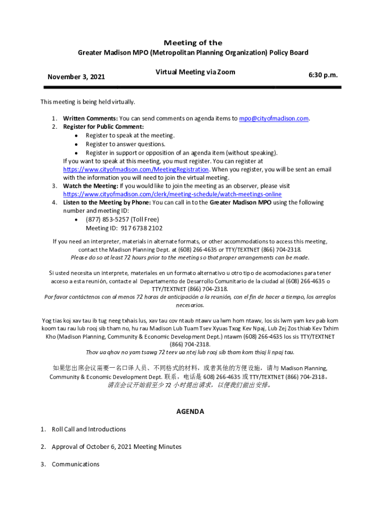 Meeting of the Greater Madison MPH (Metropolitan Planning Organization) Policy Board November 3, 2021Virtual Meeting via Zoom6:30 p.m. This meeting is being held virtually. 1. Written Comments: You