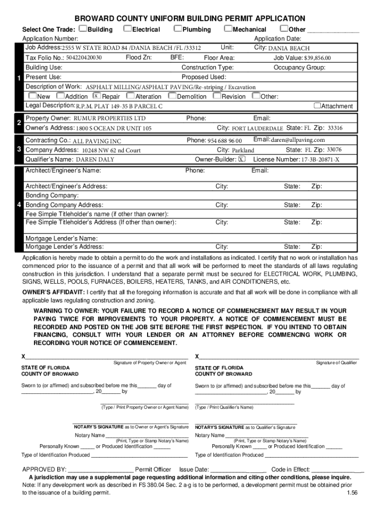 BROWARD COUNTY UNIFORM BUILDING PERMIT APPLICATION Select One Trade: Building Electrical Plumbing Application Number: Job Address:2555 W STATE ROAD 84 /DANIA BEACH /FL /33312 Tax Folio No.: 504220420030Flood