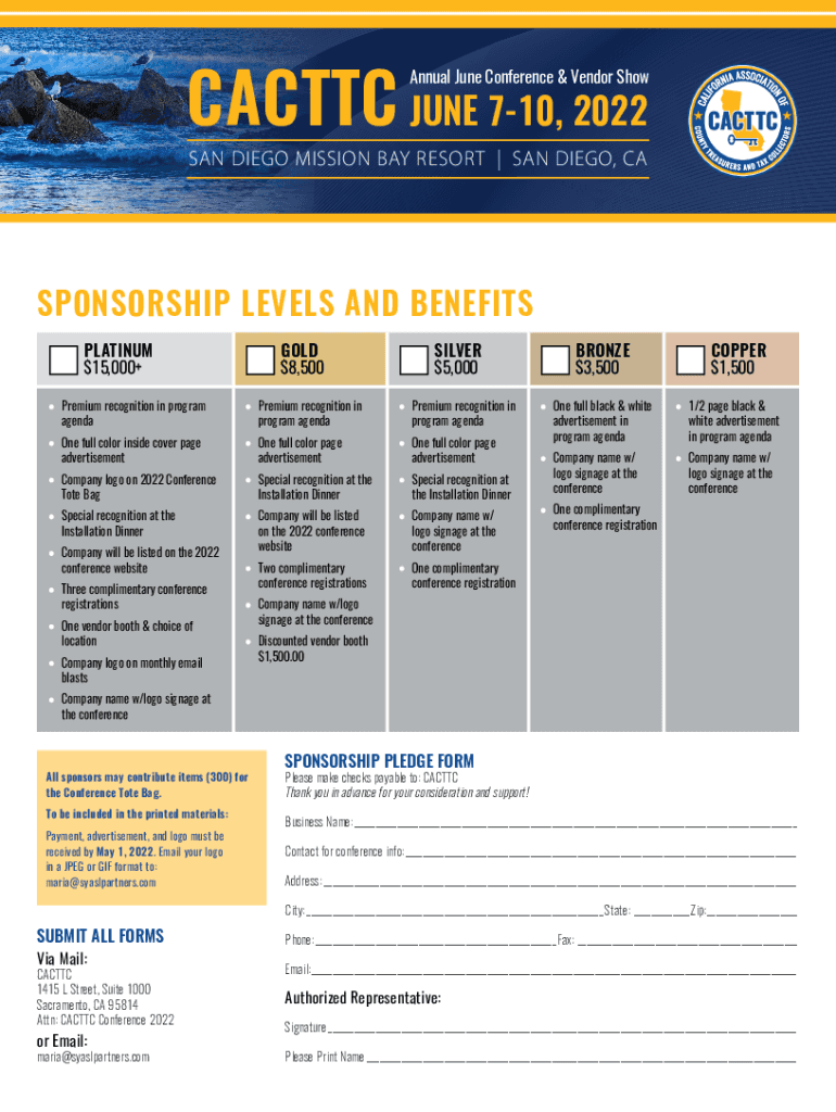 CAC TTC JUNE 710, 2022Annual June Conference & Vendor Showman DIEGO MISSION BAY RESORT | SAN DIEGO, SPONSORSHIP LEVELS AND BENEFITS