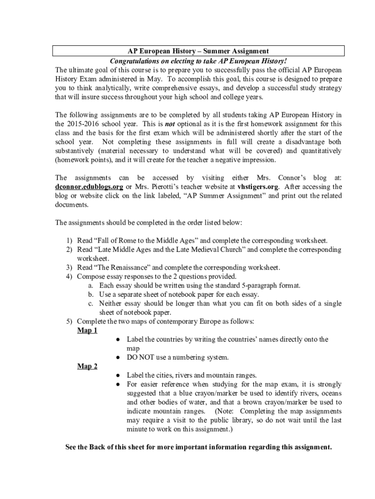 AP European History Summer Assignment Congratulations on electing to take AP European History! The ultimate goal of this course is to prepare you to successfully pass the official AP European History