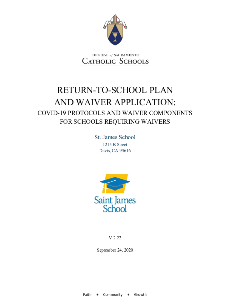 RETURNTOSCHOOL PLAN AND WAIVER APPLICATION: COVID-19 PROTOCOLS AND WAIVER COMPONENTS FOR SCHOOLS REQUIRING WAIVERS St. James School 1215 B Street Davis, CA 95616V 2.22 September 24, 2020Faith+Community+Growth1PRINCIPALS