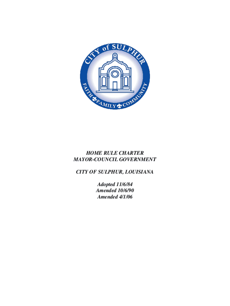 HOME RULE CHARTER MAYORCOUNCIL GOVERNMENT CITY OF Sulfur, LOUISIANA Adopted 11/6/84 Amended 10/6/90 Amended 4/1/06TABLE OF CONTENTS ARTICLE I.INCORPORATION, FORM OF GOVERNMENT, BOUNDARIES, POWERS.