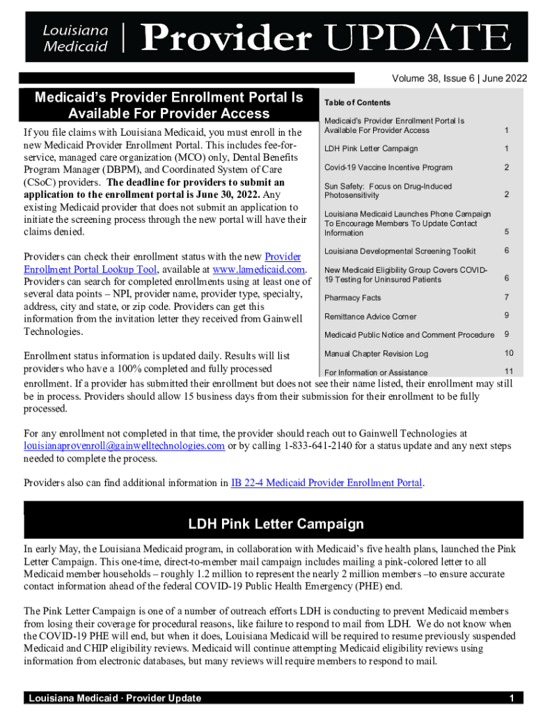 Volume 38, Issue 6 | June 2022Medicaids Provider Enrollment Portal Is Available For Provider Access If you file claims with Louisiana Medicaid, you must enroll in the new Medicaid Provider Enrollment