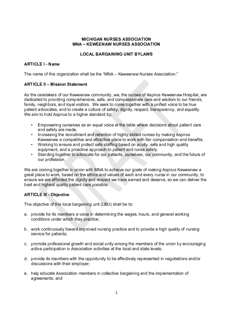 MICHIGAN NURSES ASSOCIATION MNA KEENAN NURSES ASSOCIATION LOCAL BARGAINING UNIT BYLAWS ARTICLE I Name The name of this organization shall be the MNA Kootenai Nurses Association. ARTICLE II Mission