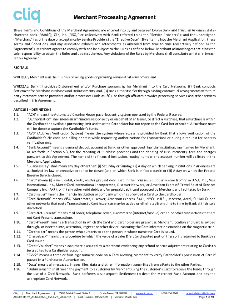 Merchant Processing Agreement These Terms and Conditions of the Merchant Agreement are entered into by and between Evolve Bank and Trust, an Arkansas state chartered bank (Bank); Clip, Inc. (ISO,