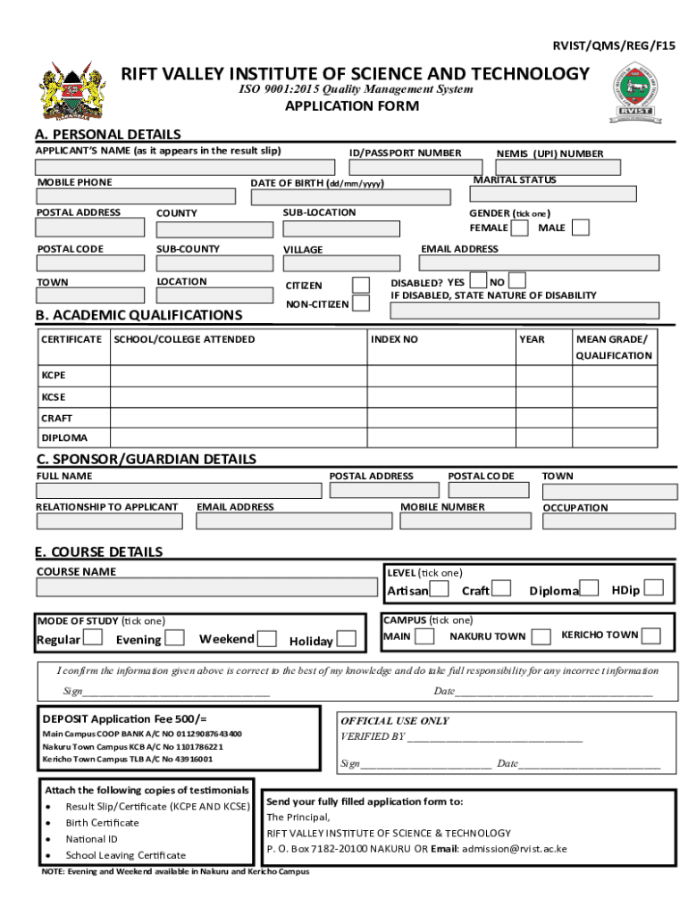RV IST/RMS/REG/F15RIFT VALLEY INSTITUTE OF SCIENCE AND TECHNOLOGY ISO 9001:2015 Quality Management SystemAPPLICATION FORM A. PERSONAL DETAILS APPLICANTS NAME (as it appears in the result slip) MOBILE