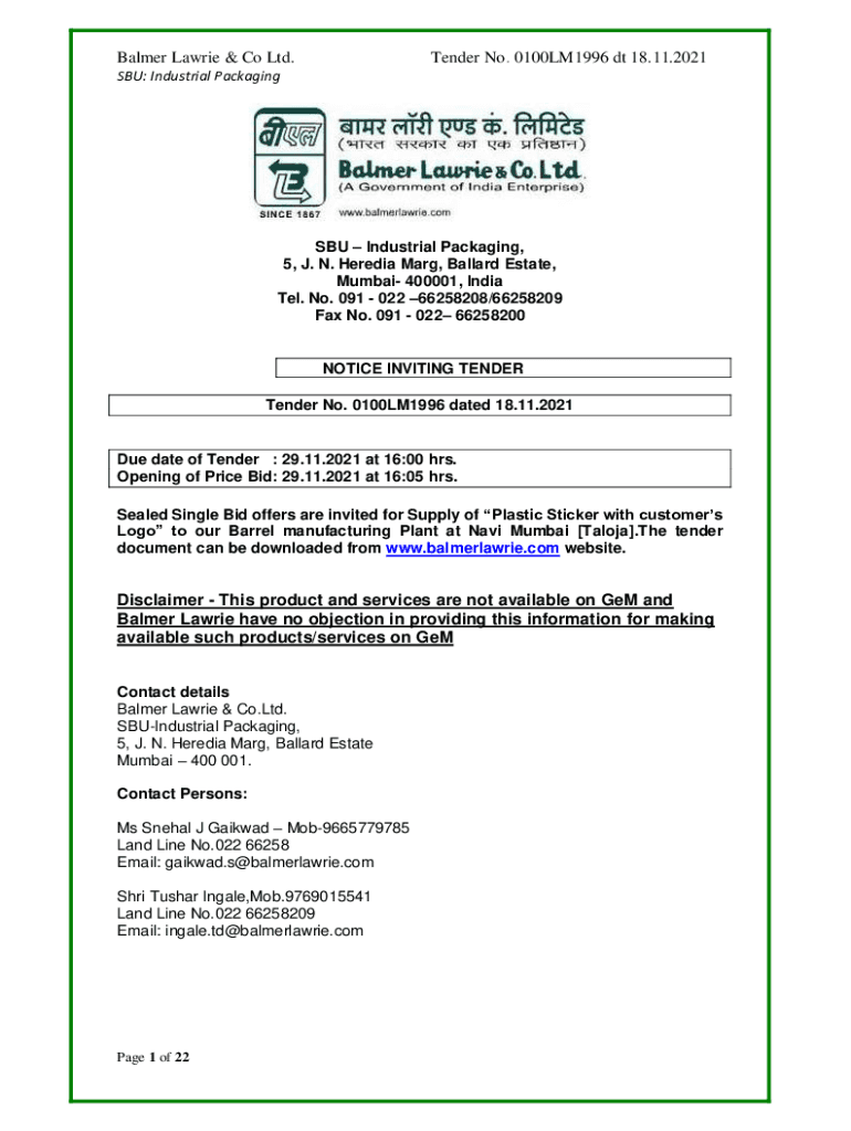 Palmer Laurie & Co Ltd. Tender No. 0100LM1996 DT 18.11.2021SBU: Industrial Packaging, 5, J. N. Hardin Mary, Ballard Estate, Mumbai 400001, India Tel. No. 091 022 66258208/66258209 Fax No. 091 022