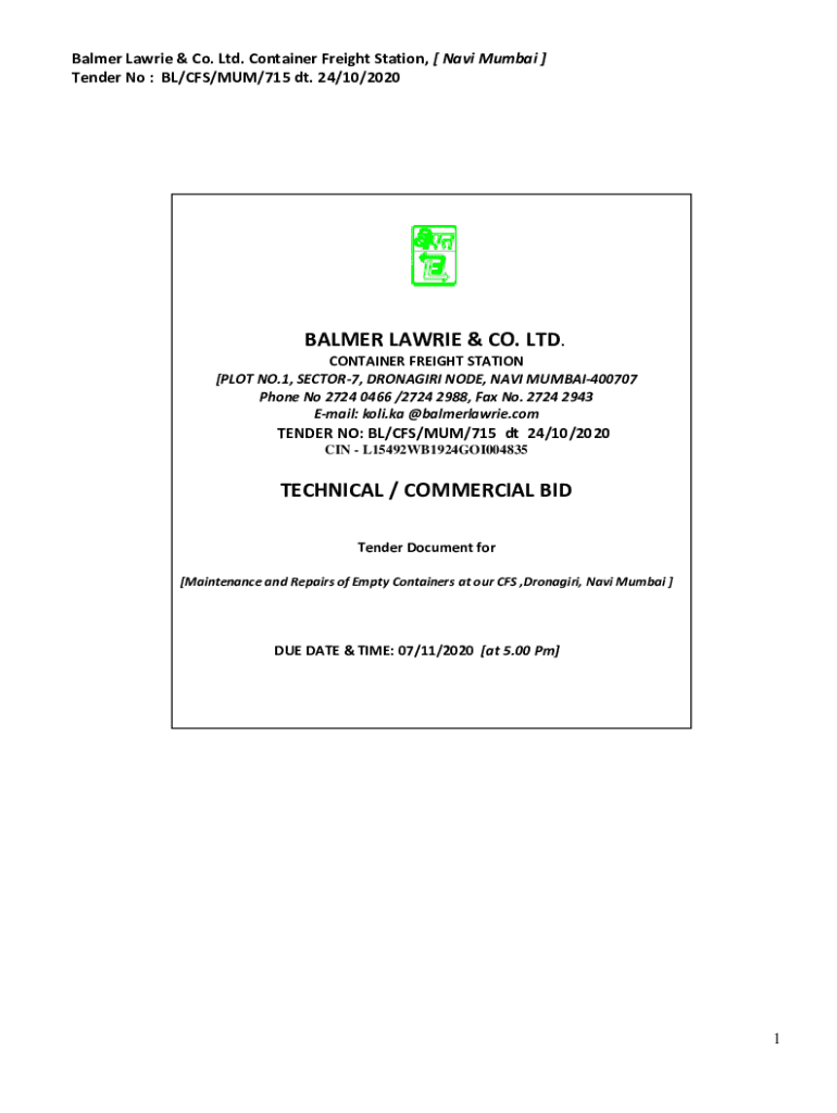 Tender No : BL/CFS/MUM/715 DT. 24/10/2020BALMER LAURIE & CO. LTD.