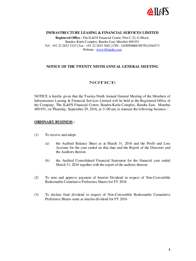 INFRASTRUCTURE LEASING & FINANCIAL SERVICES LIMITED Registered Office : The ILLS Financial Center, Plot C22, Block, BandraKurla Complex, Sandra East, Mumbai 400 051 Tel : +91 22 2653 3333 | Fax :