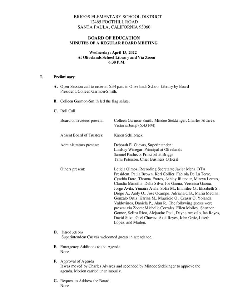BRIGGS ELEMENTARY SCHOOL DISTRICT 12465 FOOTHILL ROAD SANTA PAULA, CALIFORNIA 93060 BOARD OF EDUCATION MINUTES OF A REGULAR BOARD MEETING Wednesday: April 13, 2022, At Olive lands School Library and