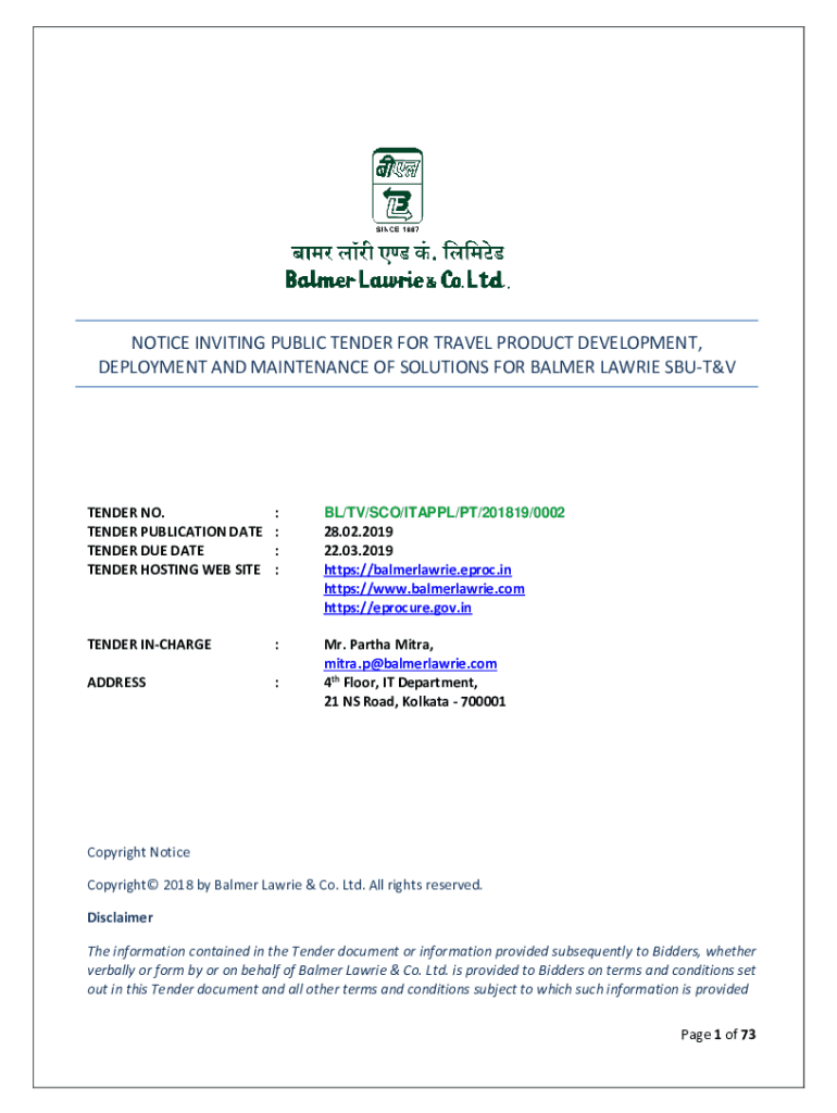 NOTICE INVITING PUBLIC TENDER FOR TRAVEL PRODUCT DEVELOPMENT, DEPLOYMENT AND MAINTENANCE OF SOLUTIONS FOR PALMER LAURIE SBUT&VTENDER NO. TENDER PUBLICATION DATE TENDER DUE DATE TENDER HOSTING Website: