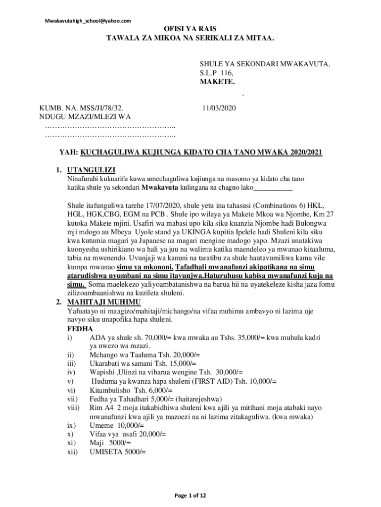 The school administration or designated staff members are required to file shule ya sekondari mwakavuta.