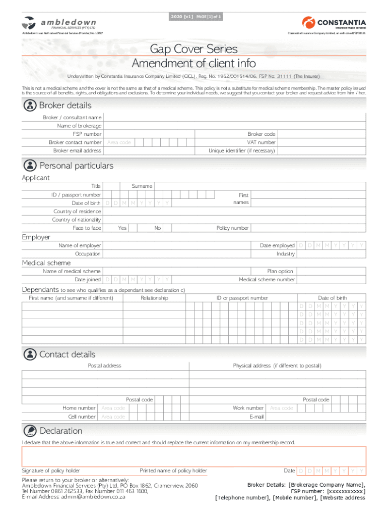 2020 [v1] PAGE [1] of 1Ambledown is an Authorized Financial Services Provider, No. 10287Constantia Insurance Company Limited, an authorized FSP 31111Gap Cover Series Amendment of client info Underwritten