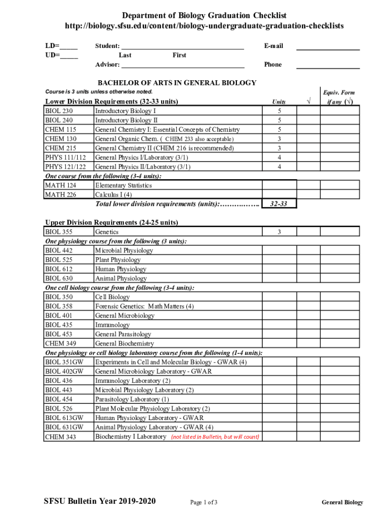 Department of Biology Graduation Checklist http://biology.sfsu.edu/content/biologyundergraduategraduationchecklists LD___ UD___Student: ___ Last First Advisor: ___Email PhoneBACHELOR OF ARTS IN GENERAL
