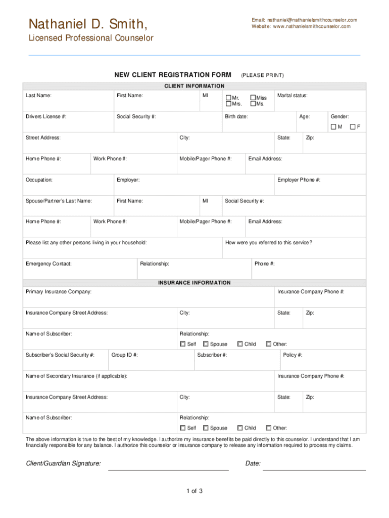 Nathaniel D. Smith, Email: nathaniel@nathanielsmithcounselor.com Website: www.nathanielsmithcounselor.comLicensed Professional Counselor CLIENT REGISTRATION FORM(PLEASE PRINT)CLIENT INFORMATION Last