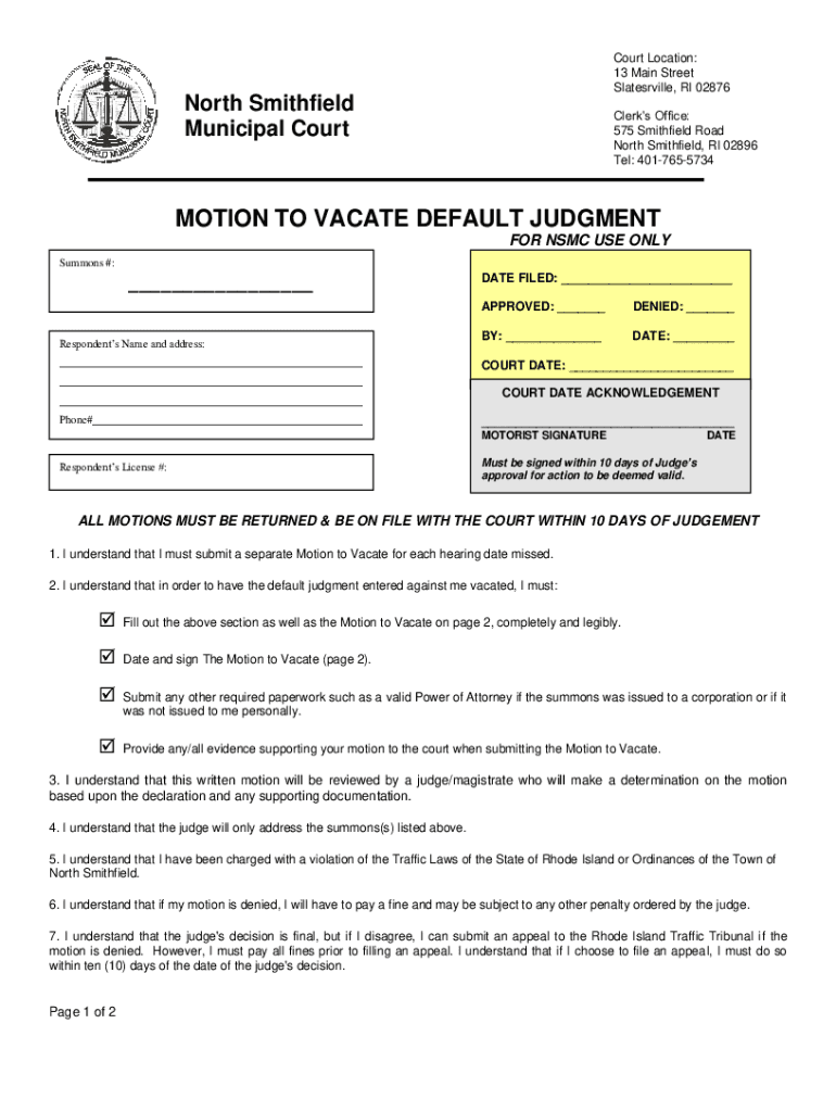 Court Location: 13 Main Street Batesville, RI 02876North Smithfield Municipal Courtiers Office: 575 Smithfield Road North Smithfield, RI 02896 Tel: 4017655734MOTION TO VACATE DEFAULT JUDGMENT FOR