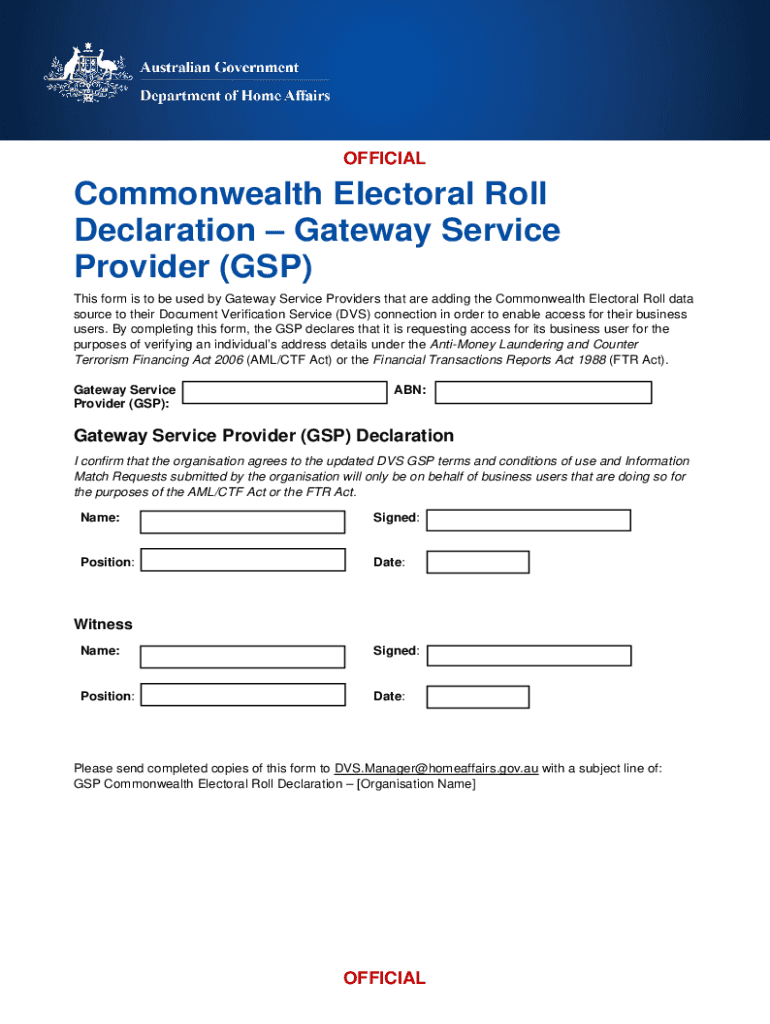 OFFICIAL Commonwealth Electoral Roll Declaration Gateway Service Provider (GSP) This form is to be used by Gateway Service Providers that are adding the Commonwealth Electoral Roll data source to