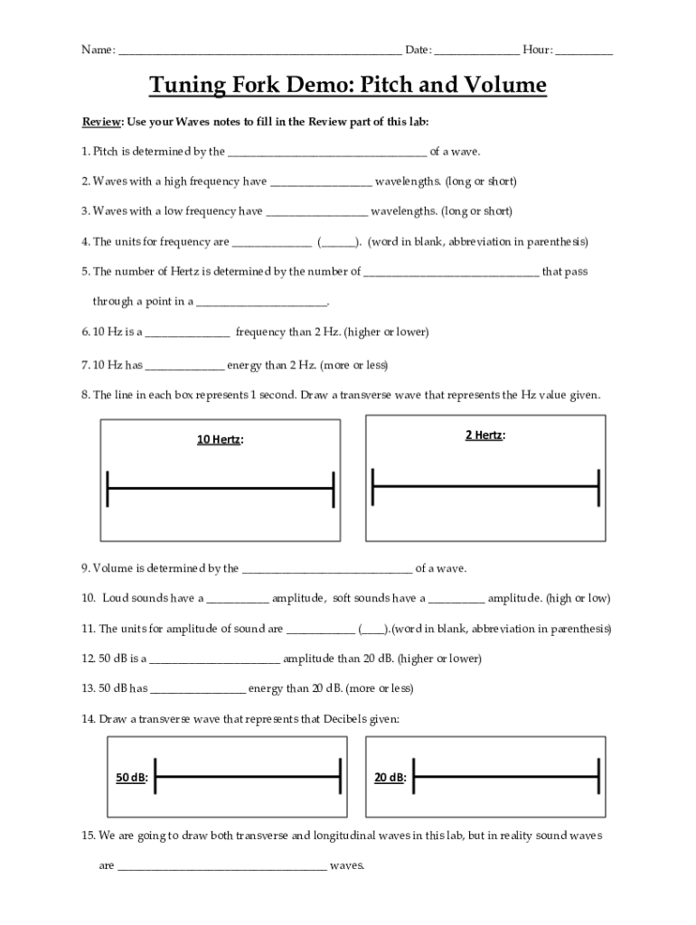 Name: ___ Date: ___ Hour: ___Tuning Fork Demo: Pitch and Volume Review: Use your Waves notes to fill in the Review part of this lab: 1. Pitch is determined by the ___ of a wave. 2. Waves with a high