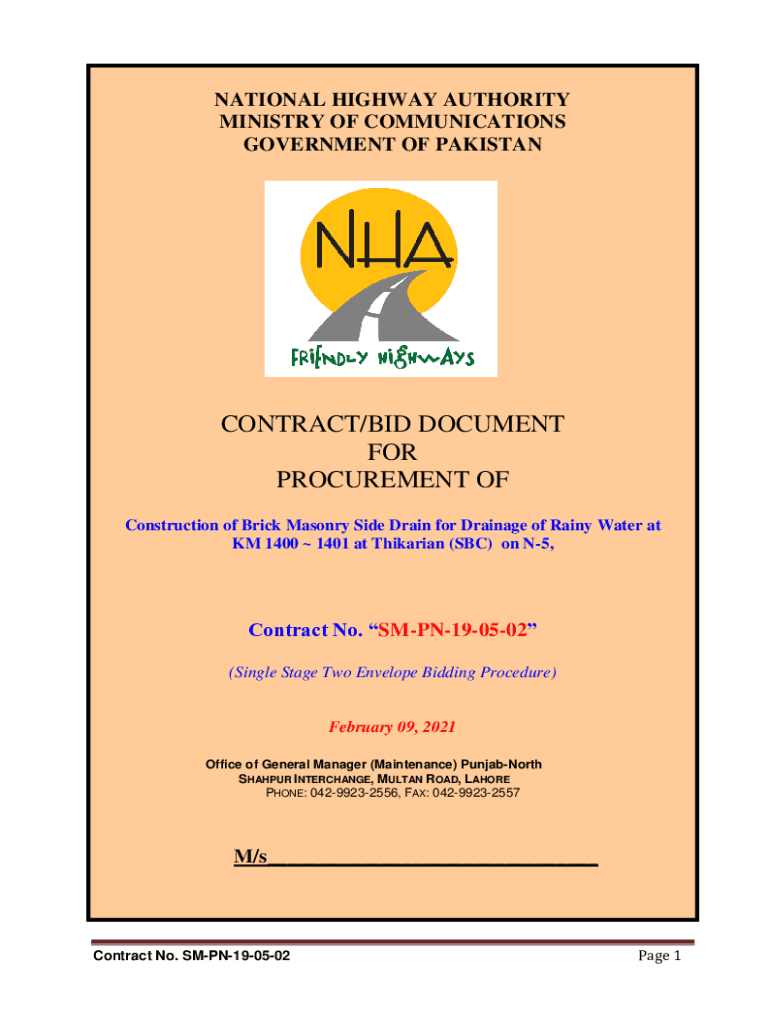 NATIONAL HIGHWAY AUTHORITY MINISTRY OF COMMUNICATIONS GOVERNMENT OF PAKISTANCONTRACT/BID DOCUMENT FOR PROCUREMENT OF Construction of Brick Masonry Side Drain for Drainage of Rainy Water at KM 1400