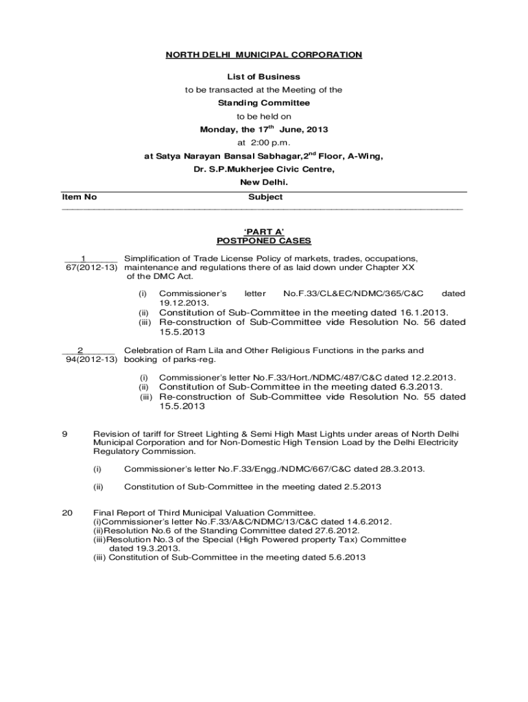 NORTH DELHI MUNICIPAL CORPORATION List of Business to be transacted at the Meeting of the Standing Committee to be held on Monday, the 17th June 2013 at 2:00 p.m. at Satya Narayana Basal Sahara,2nd