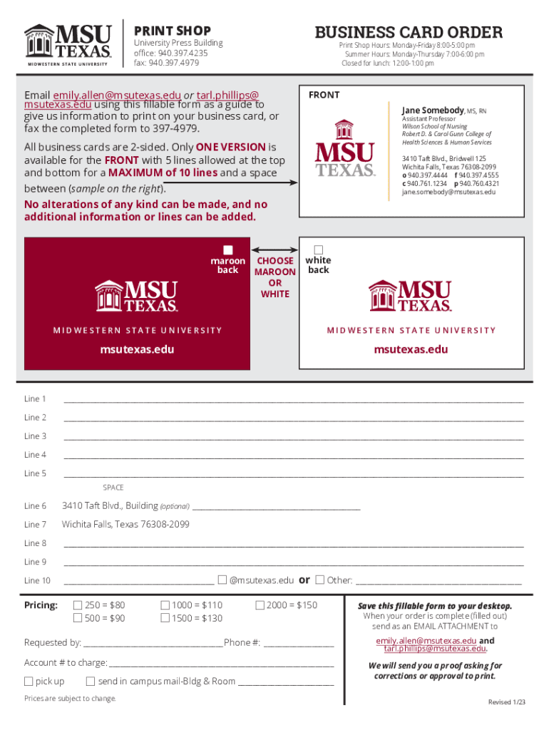 PRINT SHOPBUSINESS CARD Pre-university Press Building office: 940.397.4235 fax: 940.397.4979Print Shop Hours: Monday Friday 8:005:00 pm Summer Hours: Monday Thursday 7:006:00 pm Closed for lunch: