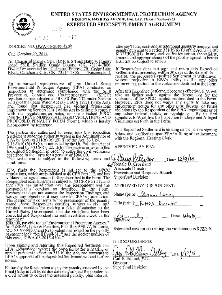 UNITED STATES ENVIRONMENTAL PROTECTION AGENCY REGION 6, 1445 ROSS AVENUE, DALLAS, TEXAS 752022733r:: expedited PCC SETTLEMENT AGREEMENTDOCKET NO. CWA062015\” 4304 \' \' On: October 22, 2014attomey\'s