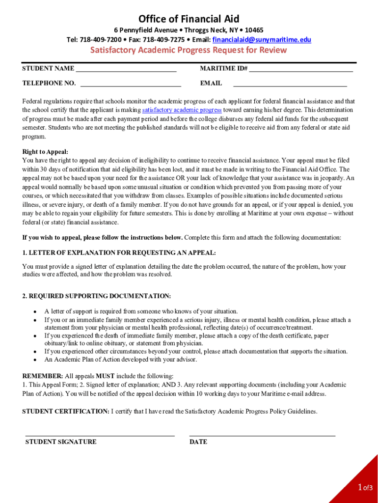 Office of Financial Aid6 Penny field Avenue Throngs Neck, NY 10465 Tel: 7184097200 Fax: 7184097275 Email: financialaid@sunymaritime.eduSatisfactory Academic Progress Request for ReviewSTUDENT NAME
