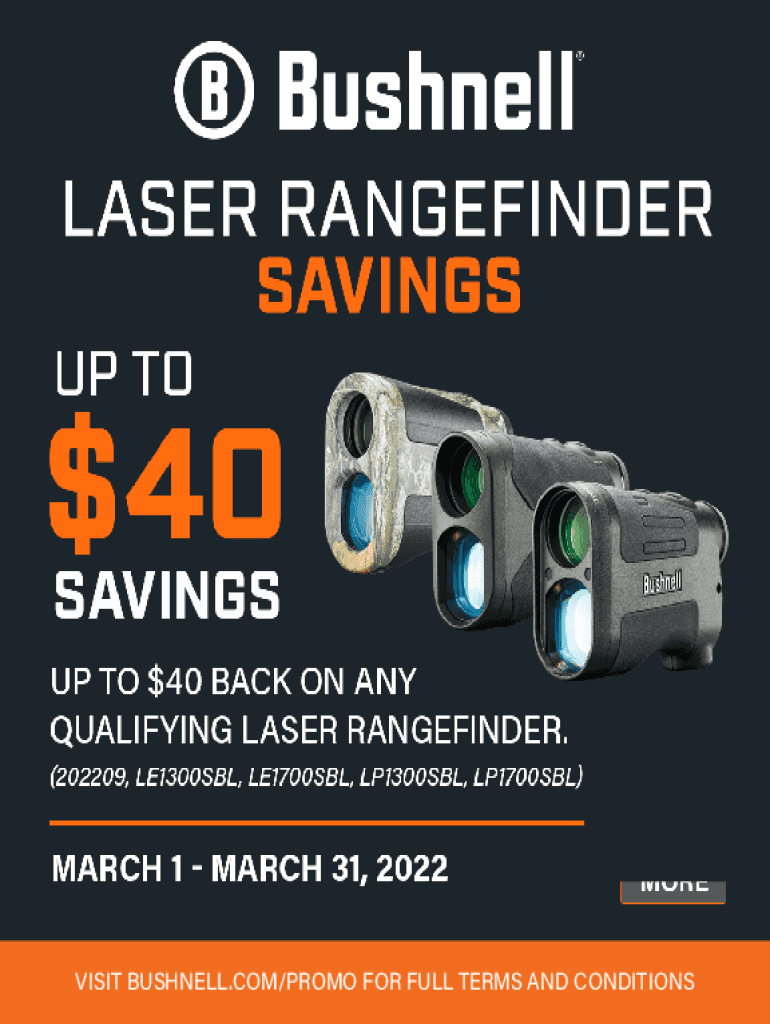 VISIT BUSHNELL.COM/PROMO FOR FULL TERMS AND CONDITIONS Bushnell Laser Rangefinder Promotion SPRING 2022o Buy a qualifying Bushnell Laser Rangefinder and get up to $40 back on your retail purchase.