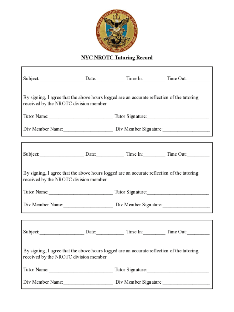 NYC ROTC Tutoring RecordSubject:___ Date:___ Time In:___ Time Out:___By signing, I agree that the above hours logged are an accurate reflection of the tutoring received by the ROTC division member.