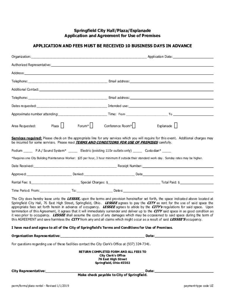 Springfield City Hall/Plaza/Esplanade Application and Agreement for Use of Premises APPLICATION AND FEES MUST BE RECEIVED 10 BUSINESS DAYS IN ADVANCE Organization:___ Application Date: Authorized
