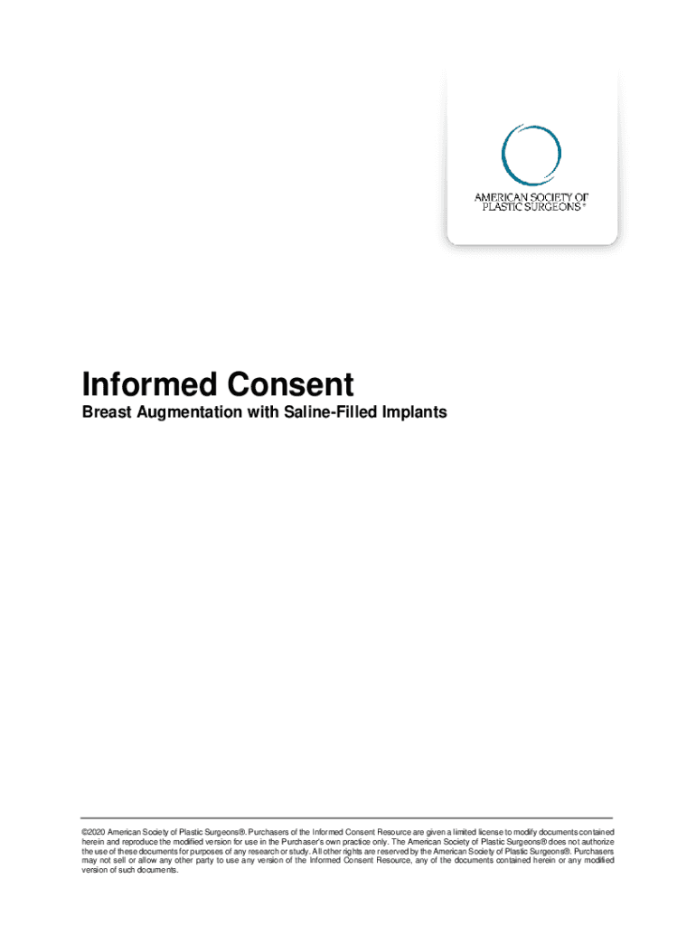 Informed Consent Breast Augmentation with SalineFilled Implants2020 American Society of Plastic Surgeons. Purchasers of the Informed Consent Resource are given a limited license to modify documents