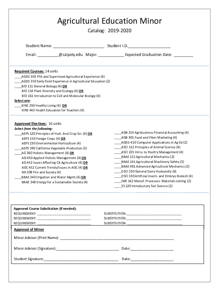 Agricultural Education Minor Catalog: 20192020 Student Name: ___ Student I.D.___ Email: ___@calpoly.edu Major: ___ Expected Graduation Date: ___Required Courses: 14 units___AGED 303 FFA and Supervised