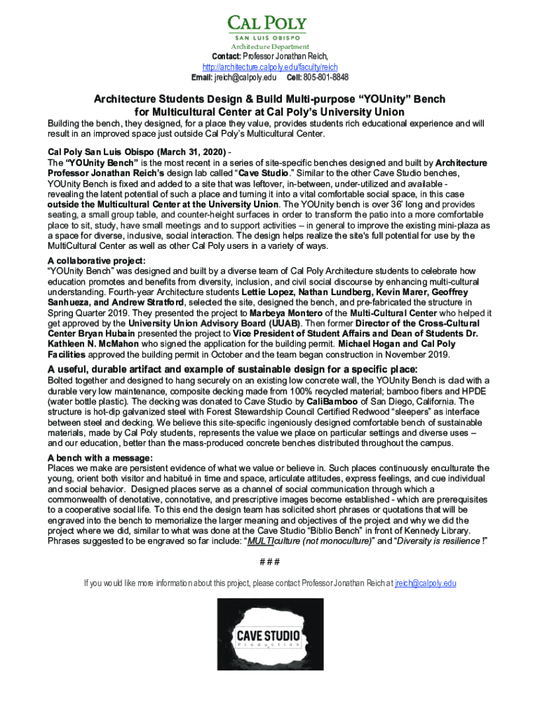 Architecture DepartmentContact: Professor Jonathan Reich, http://architecture.calpoly.edu/faculty/reich Email: jreich@calpoly.edu Cell: 8058018848Architecture Students Design & Build Multipurpose