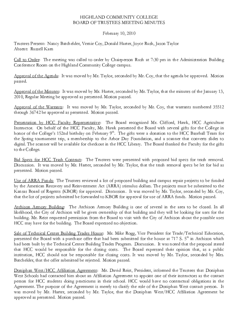 HIGHLAND COMMUNITY COLLEGE BOARD OF TRUSTEES MEETING MINUTES February 10, 2010, Trustees Present: Nancy Batch elder, Bernie Coy, Donald Charter, Joyce Rush, Jason Taylor Absent: Russell Earn Call