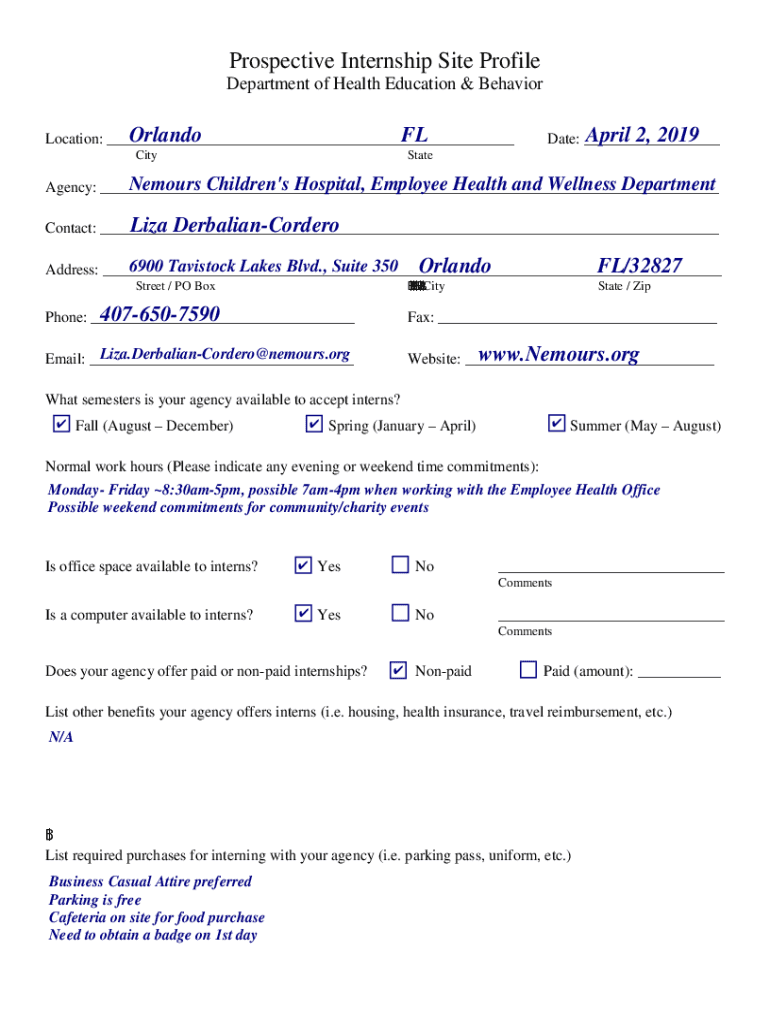 Get the free Nemours Children's Hospital - Prospective Internship Site Profile