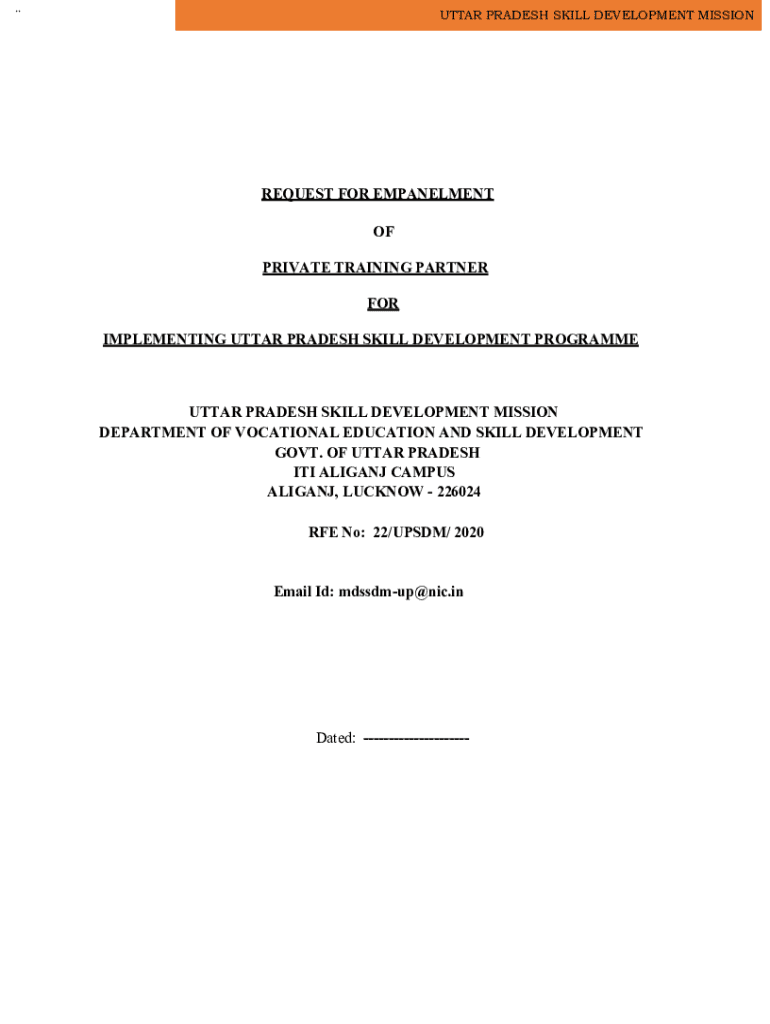 .UTTAR PRADESH SKILL DEVELOPMENT MISSIONREQUEST FOR EMBANKMENT OF PRIVATE TRAINING PARTNER FOR IMPLEMENTING UTTAR PRADESH SKILL DEVELOPMENT PROGRAMMEUTTAR PRADESH SKILL DEVELOPMENT MISSION DEPARTMENT