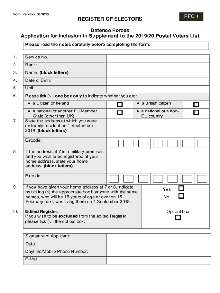 Form Version: 08/2015RFC 1REGISTER OF ELECTORSDefence Forces Application for inclusion in Supplement to the 2019/20 Postal Voters List Please read the notes carefully before completing the form. 1.