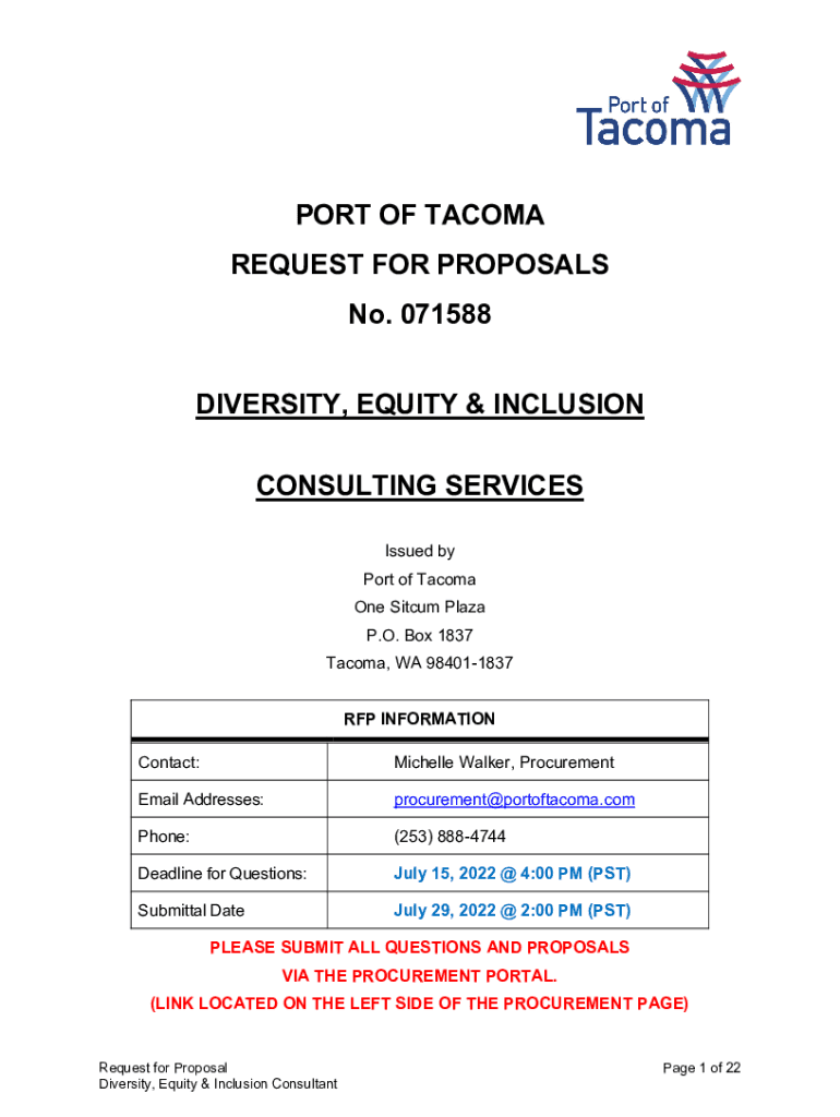 PORT OF TACOMA REQUEST FOR PROPOSALS No. 071588 DIVERSITY, EQUITY & INCLUSION CONSULTING SERVICES Issued by Port of Tacoma One Sitcom Plaza P.O. Box 1837 Tacoma, WA 984011837 RFP INFORMATION Contact:Michelle