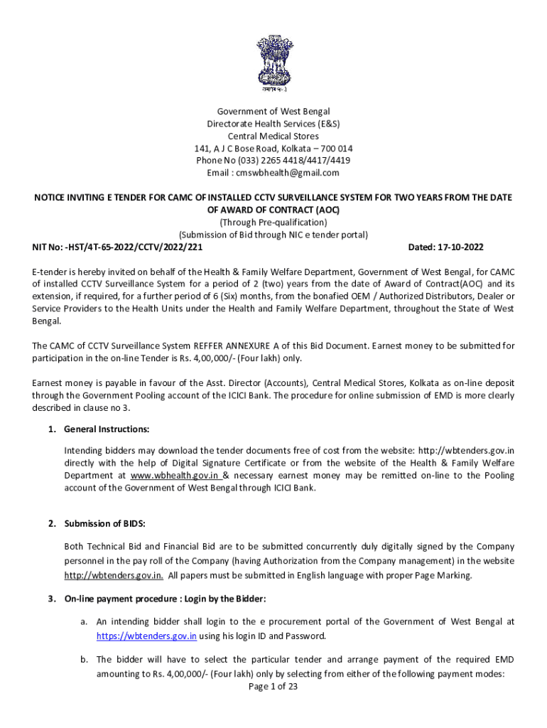 Government of West Bengal Directorate Health Services (E&S) Central Medical Stores 141, A J C Bose Road, Kolkata 700 014 Phone No (033) 2265 4418/4417/4419 Email : cmswbhealth@gmail.com NOTICE INVITING