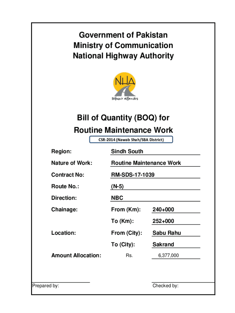 Government of Pakistan Ministry of Communication National Highway Authority Bill of Quantity (BOX) for Routine Maintenance Work CSR2014 (Away Shah/SBA District)Region:Sindh Southgate of Work:Routine
