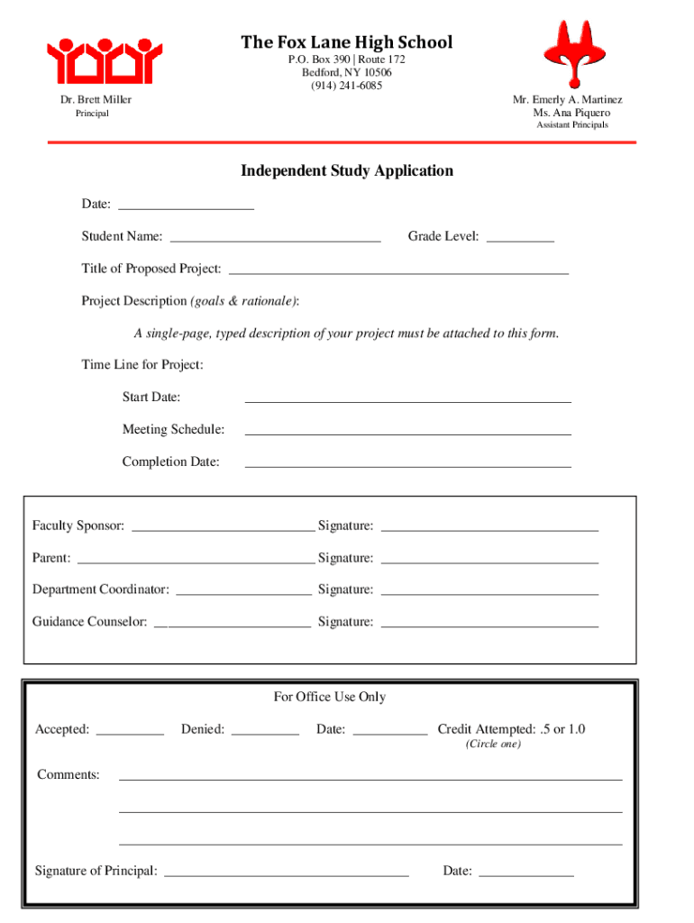 The Fox Lane High School P.O. Box 390 | Route 172 Bedford, NY 10506 (914) 2416085 Dr. Brett Miller Mr. Emery A. Martinez Ms. Ana PiqueroPrincipalAssistant PrincipalsIndependent Study Application Date: