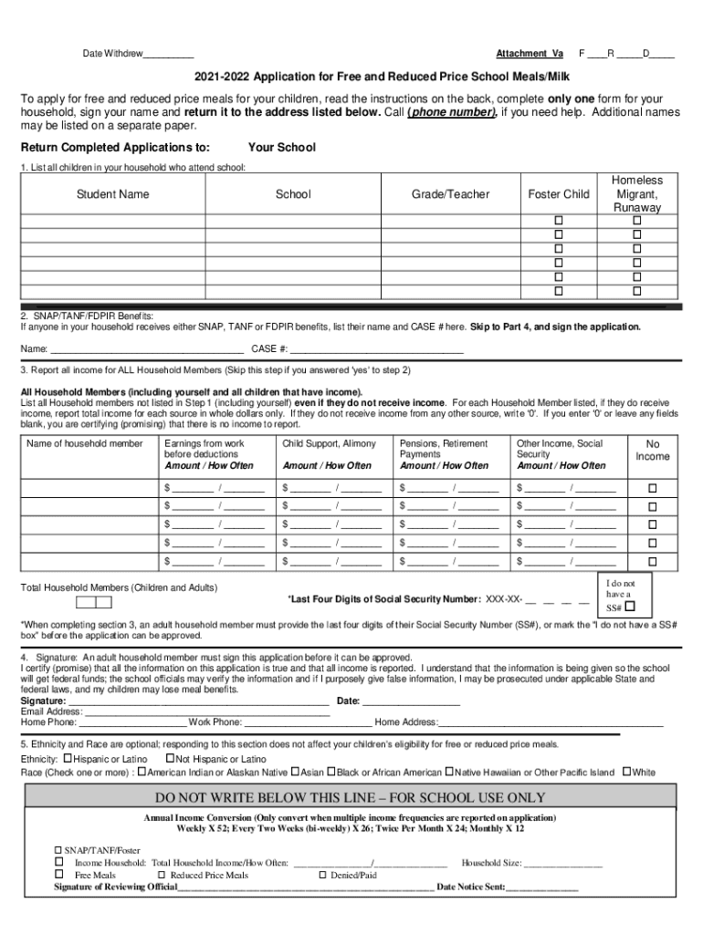 Date Withdrew___Attachment Van ___R ___D___20212022 Application for Free and Reduced Price School Meals/Milk To apply for free and reduced price meals for your children, read the instructions on the