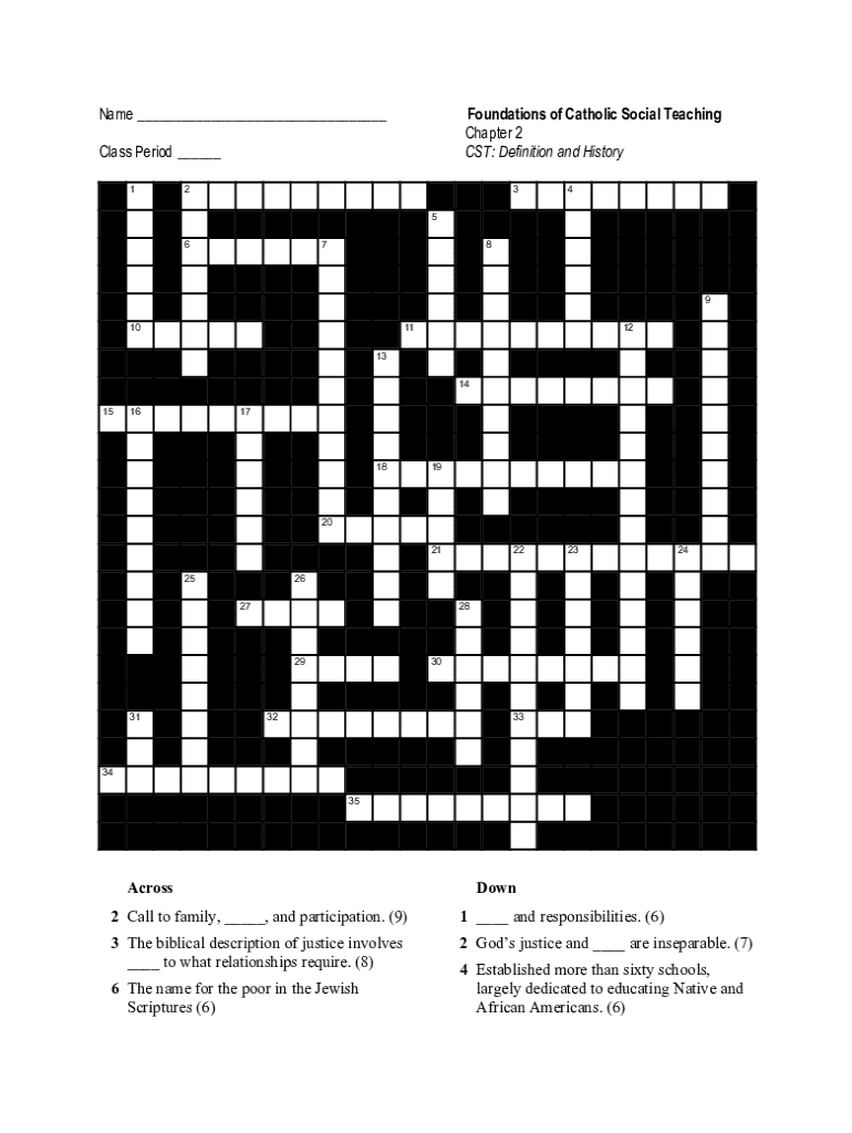 Name ___Foundations of Catholic Social Teaching Chapter 2 CST: Definition and HistoryClass Period ___ 12345 6789 10111213 14 151617181920 21 25232426 272829312230323334 35AcrossDown2 Call to family,