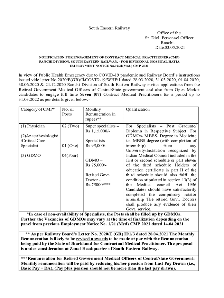 South Eastern Railway Office of the Sr. Dive. Personnel Officer Ranchi. Date.03.05.2021 NOTIFICATION FOR ENGAGEMENT OF CONTRACT MEDICAL PRACTITIONER (CMP) RANCHI DIVISION, SOUTH EASTERN RAILWAY, FOR