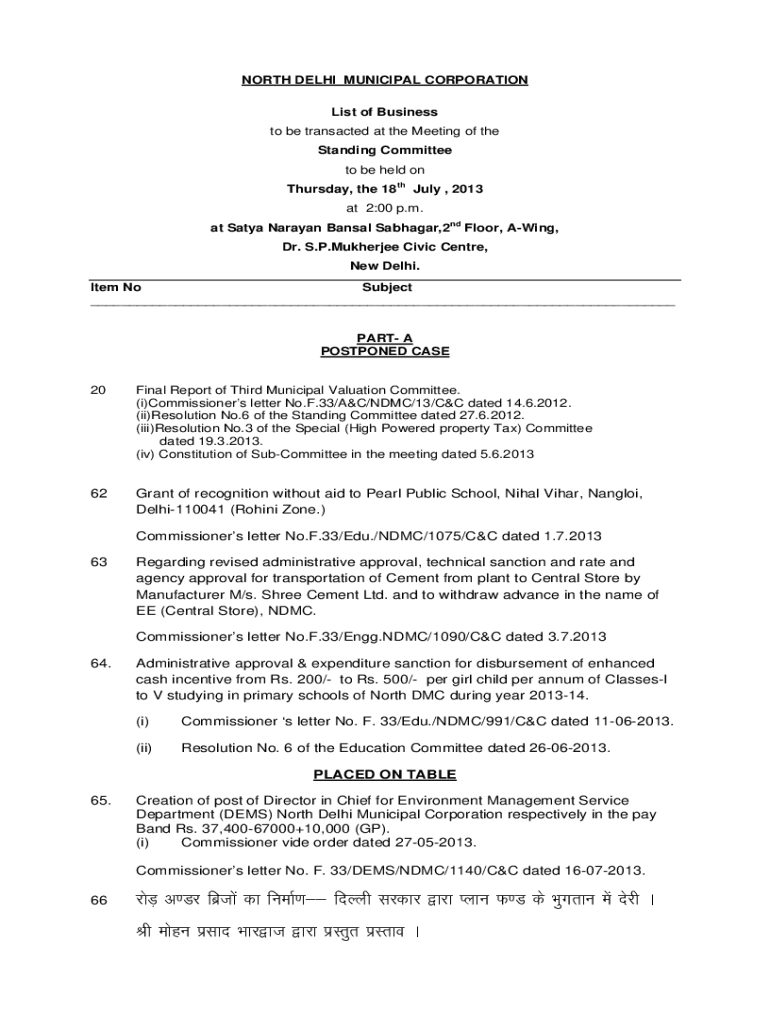 NORTH DELHI MUNICIPAL CORPORATION List of Business to be transacted at the Meeting of the Standing Committee to be held on Thursday, the 18th July 2013 at 2:00 p.m. at Satya Narayana Basal Sahara,2nd