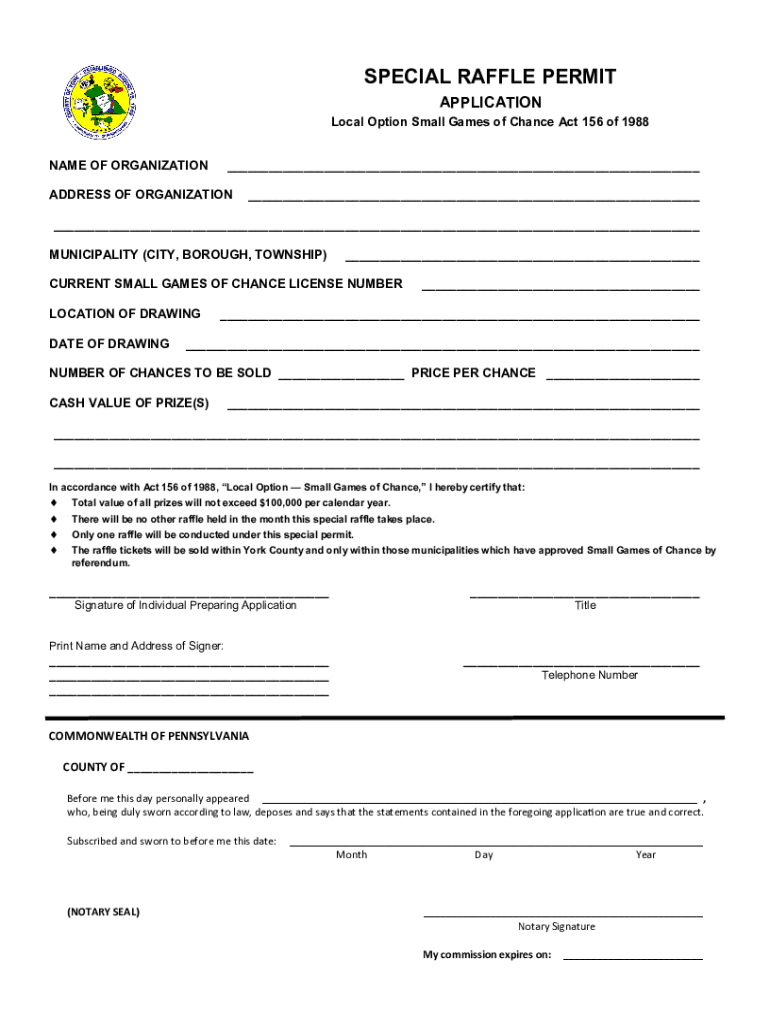 SPECIAL RAFFLE PERMIT APPLICATION Local Option Small Games of Chance Act 156 of 1988 NAME OF ORGANIZATION___ADDRESS OF ORGANIZATION______ MUNICIPALITY (CITY, BOROUGH, TOWNSHIP)___CURRENT SMALL GAMES