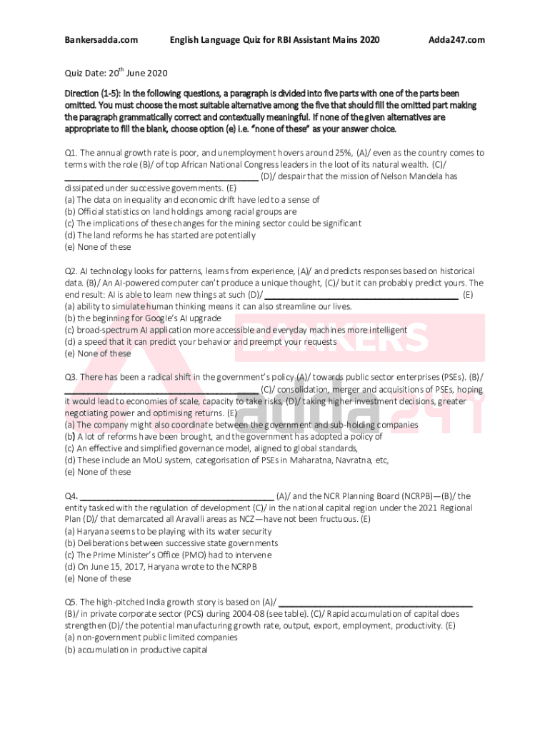 Bankersadda.com English Language Quiz for RBI Assistant Mains 2020Adda247.comic Date: 20th June 2020 Direction (15): In the following questions, a paragraph is divided into five parts with one of